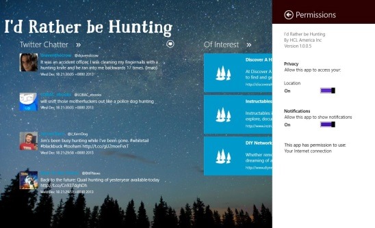 I’d Rather be Hunting is a free Windows 8 lifestyle app. It’s a really good Windows 8 entertainment app, plus a social and learning app, that can help you to learn basic and useful tips and tricks of hunting, shop for the tools and items of hunting, discover and connect with people who have same interest in hunting, find some more new hobbies, and mark the tutorials as favorites, and finally share the information you found with friends from using the Windows 8 share charm. The app is published in the Windows Store by HCL America Inc.