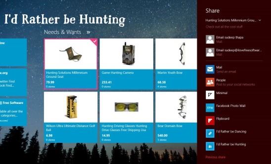 A really cool feature that I liked in this Windows 8 lifestyle app is it allows you to directly share the information of hunting tools present under the Needs & Tools label, from the main screen itself. You don’t need to open the tools information first and then share it, but all you need to do is simply right-click on the desired tool and the app automatically brings up the Share Charm in the screen.