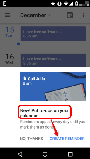 Google Calendar Android app is recently updated with a new feature, called Reminder. Using this feature, you will be able to add to-dos for a particular day to your Google Calendar. Your reminders are visible along with added events but in different colors. This will help you to easily recognize the to-do items that you need to complete.