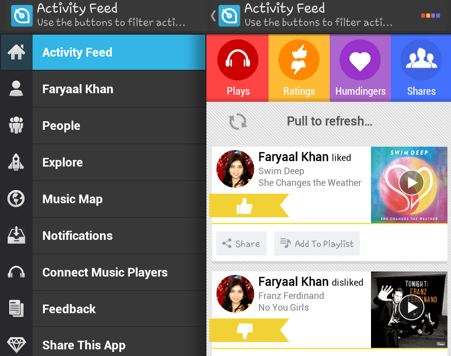 Soundwave is a free Android app using which you can share music with friends and followers and discover music other people are listening to. The app allows you to add songs from others playlists, like and dislike songs, watch videos directly inside the app. It also provides you a platform to let you check what people are listening to in your area. You can invite friends from Facebook, Google, and Twitter, as well as follow people from around the world. All you have to do is listen music from any music player on your phone and it will automatically be synced into your feed.