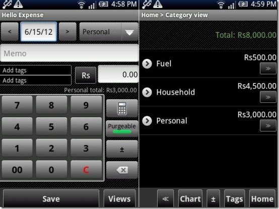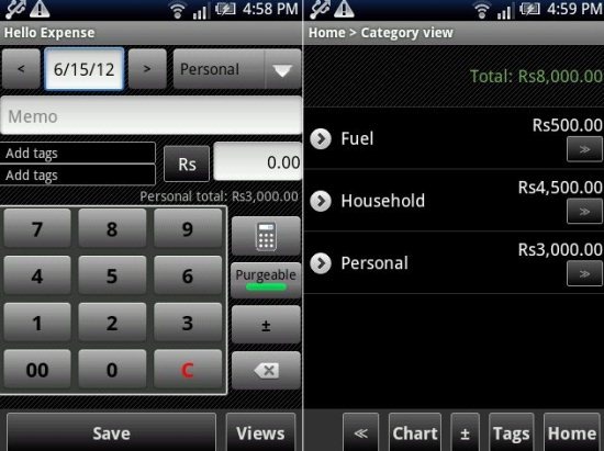 Hello Expense is a free Android expense manager app that records and manages all the expenses on Android. The app is very simple and provides easy interface with number pad to record expenses. You cannot give the name to every expense. The app only allows you to create categories and then add expenses in the created categories. You can then view all your expenses altogether or category wise. While recording expenses you can easily switch between multiple currencies and then record expenses. Also, you can view all the data on daily basis, on week basis, month basis, and on year basis.