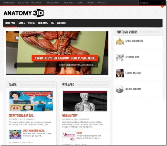Anatomy 3D is a free anatomy website that provides quality as well as comprehensive 3D anatomy contents. This free anatomy website provides you various anatomy videos, web apps, and mobile apps, with rich and qualitative anatomy contents. It also provides you 3D anatomy contents in iOS and Android formats so as to build up your biological knowledge with ease. It provides you highly rich 3D anatomy contents related to human body, surgical tools, physiology, primal pictures, visual atlas of various organs, and more, so that you can enhance your knowledge in field of medical science and know more about your body. This free anatomy website provides you various doctor and surgery games, so as to enjoy and learn about human body, medical tools, and other biological aspects in fun way. Not only that, it lets you share custom view on various social networks like Facebook and Twitter and at the same time provides you search tool so as to explore more human anatomy.