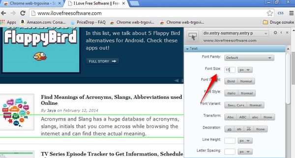 This is a style editor, so you can tweak a lot of stuff, but the one that interests us the Font Size option, see image above. Select the text that you want to resize on the website, left click on the extensions’ icon, select Open Stylebot and simply change the Font Size.