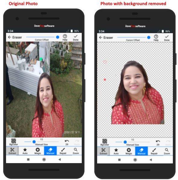 The manual mode is the one which I liked the most as it is the most controlled background erasing method. After erasing the background, you can smoothen the edges and extract the photo. Now save the photo to your phone gallery. The app does not offer new backgrounds for your photo.