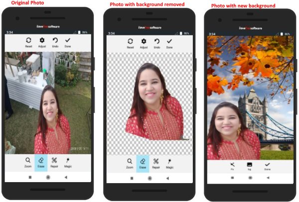 These are some free Android apps to remove background from photos. You can try anyone of them to easily remove background from photos. You can also apply new backgrounds to these photos if you like. The photos with erased background can be saved to your phone gallery and used anywhere you like. Do try these apps out.