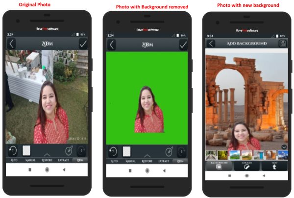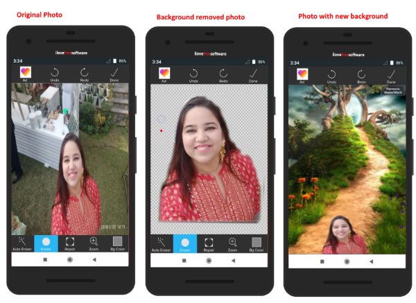 You can zoom in on the image, choose manual or auto background removal, etc. In manual mode, you have to erase the background using the eraser given. Whereas, in auto mode you can mark areas in the picture which are to be removed. I found the manual mode more useful than the auto mode. After erasing the background, you get the option to smooth the edges. After that you can add a new background to this image using the given backgrounds. Once done you can go ahead and save the photo to your phone gallery. You also get the option to share this photo with friends.