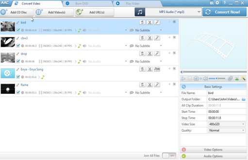 Interface is more modern than the one offered by Oxelon. Notice that I selected both audio and video files and added them to the list for audio conversion/extraction. Output format can be set in the top right corner, next to the “Convert Now” button. There are presets for MP2, MP3, OGG, AAC, AC3, AIFF, FLAC, WAV, WMA, etc. Additional tweaks to the output quality can be made in the bottom right corner. When you’re done with setup, just click on the “Convert Now” button and extraction will start.