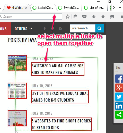 Snap Links Plus plugin is similar to Multi Links plugin. Almost all the options which are available in Multi Links can be used with this add-on too. You can use Left/Middle/Right mouse button to select multiple links and open them in new tabs or windows. It creates a rectangle for the selection and shows you the total number of links available under that rectangle. After this, you can release the mouse button to open all those links. You can also bookmark the links or copy them to the clipboard.