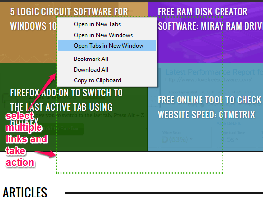 Multi Links is one of the best Firefox add-ons in this list. It lets you set left mouse, right mouse, or middle mouse button to select multiple links and open them in new tabs. Apart from this, you can also enable the option to open links in new windows. You need to press and hold the mouse button (whatever you have set) to select the links and it will automatically open those links for you.
