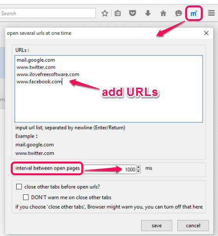 Multi Open plugin is not able to open multiple links directly from a webpage or website, but yes it is great to open multiple saved links in new tabs. After installing this add-on, you can use Options of this add-on to insert the URLs which you want to open automatically. Apart from this, you can also set interval (in milliseconds) between open pages. Finally, you can save the changes and use its extension icon to open all the saved URLs in a single click. It is pretty useful for opening the websites which you use regularly in a day.