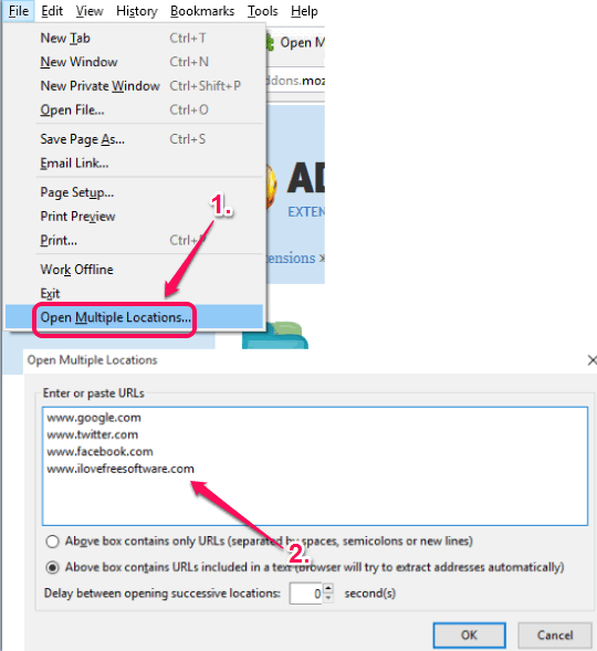 Open Multiple Locations is very simple to use and works similar to above-listed add-on. You can open its Options window and insert URLs in the available box. You can also insert delay time for URLs. The unique feature of this extension is that if there is some text available in between the URLs, then it can automatically exclude the text and will only extract URLs to open in new tabs. When you have added the URLs, you can press OK button to open all the URLs.