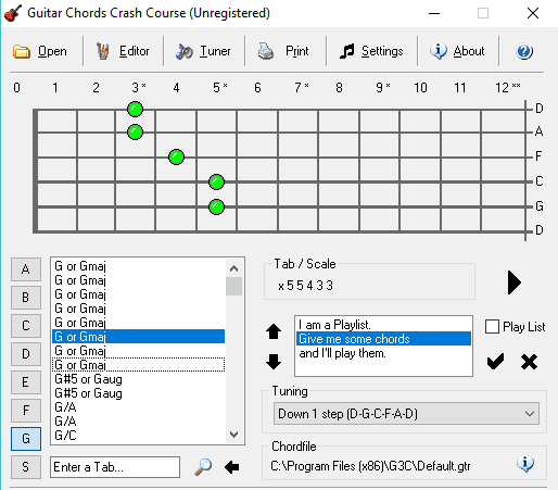 Guitar Chords Crash Course is also a very useful software that can help you generate guitar chords with ease and in no time. To do that, all you would need is pick a chord root note and the required chord type such as major, minor, dominant, etc. Then it will generate and show you the guitar chords on a fretboard. Not just that, you can even play the chords if you want using the built-in player. One of the useful features of this software is that it allows you to manually choose the tuning before generating chords.