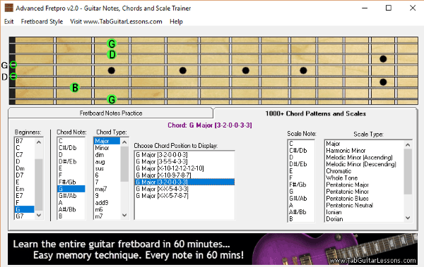 Advanced Fretpro is a free and easy to use guitar chord generator software for Windows. You can use it to easily generate guitar chords by choosing a chord type and root note. The root notes are available for both beginners and experienced users. It has a fretboard where you can see the generated chords. Apart from showing you only one position based on your selection, this software also shows other chord positions which can be used for playing that particular guitar chord. Additionally, it also comes with an option to generate scales by selecting a scale note and scale type.