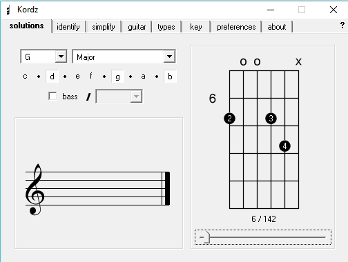 After opening this software, simply click on the “Solutions” tab at the top. Now, you can see the option of picking the chord type and root note required for generating chords. When you do select them, it will generate and display the chord to you on a fret image. You will also see a slider that can be used to see other variants of the generated guitar chord.