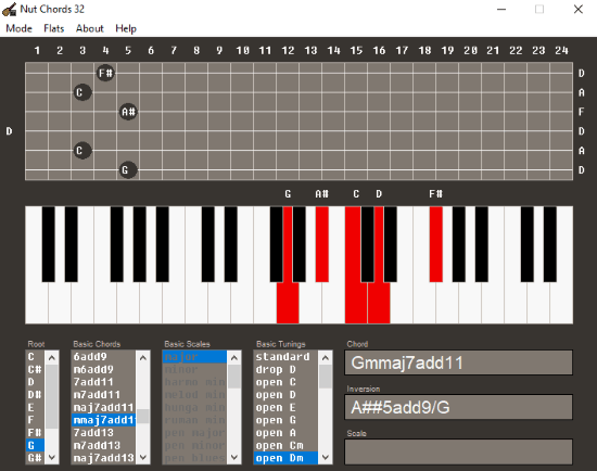 Nut Chords 32 is also one of the simple guitar chord generator software which you can use on your Windows PC to generate guitar chords. It lets you choose from different chord types and root notes to automatically generate and show you the chords on a fretboard. One of the useful features of this software is that it allows you to choose tuning manually to get perfect results. In addition to guitar chords, this one also comes with the option to generate piano chords based on your root and chord type selection and scales.