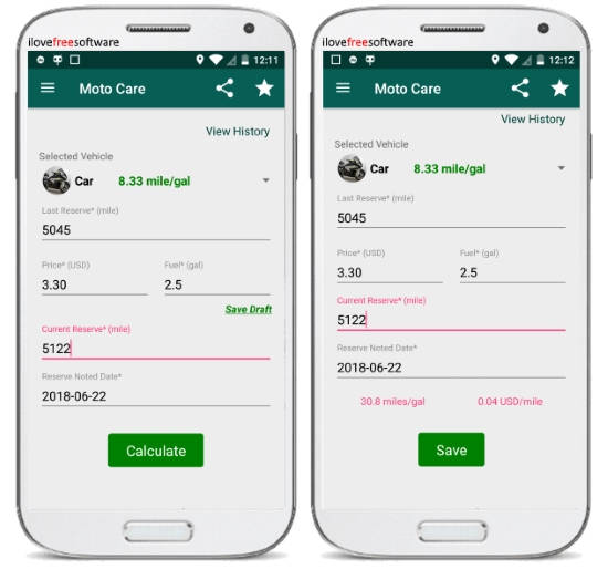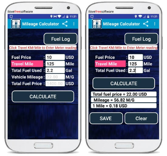 When you’re done with that, open the app and then enter the travel distance after refueling, total fuel used, and the fuel cost. After that, tap on the “Calculate” button and then it will automatically take your input into consideration and calculate the vehicle’s mileage. It will also show the fuel cost per mile/kilometer.
