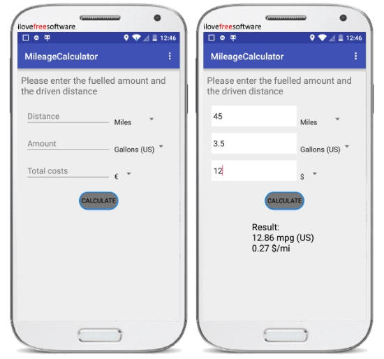 Mileage Calculator (by MW WebWork) can also be used to easily calculate your vehicle’s mileage with ease. This one uses the traveling distance info and the fuel amount to calculate the mileage. After opening the app, simply go to the app settings and then choose the mileage measuring unit either as liter per 100 km, km/liter, mpg (US), and mpg (UK). Once done, proceed to the main screen and then enter the distance traveled after refueling (in miles or kilometers), fuel amount (in gallon US/UK or liter), and the total fuel cost.