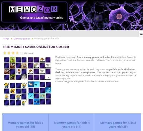 Memozor is nice website with memory games. The entire website has memory games and memory tests. As you can see in the screenshot above, the games on this website have been categorized with age like games for 3 years old, games for 4 years old, games for 8 years old, etc. You can choose games according to your child’s age. There are many fun games like Mario kart, minecraft, Christmas, animals, stencil, frozen, snowman, kindergarten, etc. All the games are based on the same pattern of game play. That is flipping two cards at once and remembering the picture in the card you opened. Then you open two more cards and see if you can match any of the images. The matched cards would remain face up and would be hazed out. The game continues until you match all the cards.