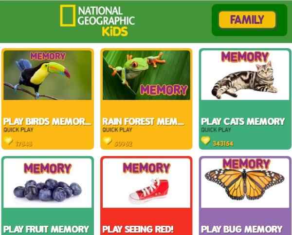 National Geographic Kids website has a entire section dedicated to memory games. The memory games section has more than 20 games in it. The memory games are all on the same pattern. In these games you will find face down cards and you will be allowed to open 2 cards at a time. Using this method you have to match cards with same images. The matched cards will disappear from your screen. The game gets over when all cards are matched.