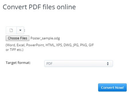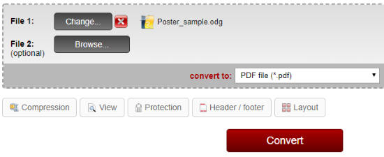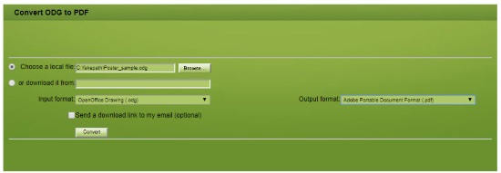 The website called Convert Files is an online ODG to PDF converter. When you open the mentioned link, it shows an interface of the converter. You can choose a file from your computer. Once the ODG file imported, you can choose the output format; PDF. There are other formats which you can choose such as PNG, JPG, SWF. When the files get converted, you can download the output of PDF file.