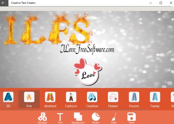 On this page you can enter the text you want using the text or alphabet options given at the bottom toolbar. In the text option you will have various fonts available which you can choose. Apart from font you can also choose the font color and make it bold or Italics. In the alphabet option you will see various alphabets in 3D format. You can also choose these alphabets to form a word. Apart from these you can also change the background of the image and add stickers to the image that you are creating. The stylized text creation can be saved on your computer in JPEG format.