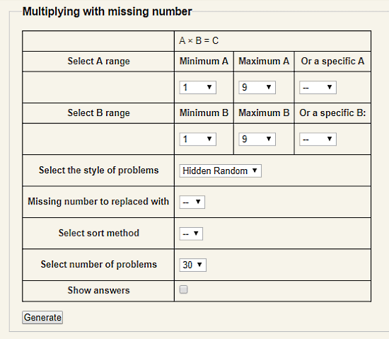 SuperKids.com is another free website that provides educational material for parents, teachers, and students. This website covers math topics from kindergarten to mid-school. Each topic has its own worksheet generator customized according to that topic itself. You can select the type of problems for the worksheet and also specify custom values where possible (depending on topic). In the end, you get an option to select the number of problems for the worksheet. Then, it will generate your worksheet and opens it in the new tab. From there you can print it to PDF with ‘Ctrl+P‘ option.