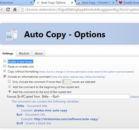 What you’ll find is the “Copy without formatting” check mark, which you can activate, see image above. Do that, put a check mark and every time that you make a text selection within Chrome text is going to be automatically copied without text formatting, or in other words, as plain text. Other useful options are available, like you can see at the bottom of the screen. Automatic comments can be added before or after the copied text. You can add browser window title, URL from where the text was copied or a manually typed text.