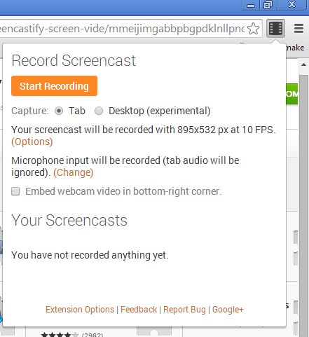 Size and quality of the recording can be customized and you can also capture audio if you want using the microphone. Other options are also available which can be accessed by clicking on the Extension Options link at the bottom of the control panel.
