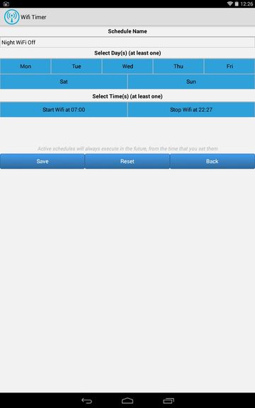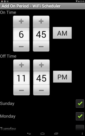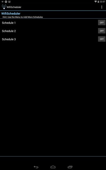 WiFi Scheduler is a wifi scheduler app for Android where unlimited number of wifi scheduled switches can be setup. What I mean by scheduled wifi switches is exactly that, a scheduled switch that will either turn off, or turn on wifi, at times that you want.