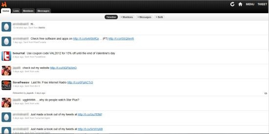 Hahlo is a free Twitter application made specifically for iPhone users. Though it is mainly for iPhone users, but it can also be used in other devices and desktop browsers. We are reviewing this app for Chrome browser. This Twitter application shows your Twitter account in a straight forward interface. This Twitter application includes a Menu option which allows you to find users, view friends and followers, view Re-tweet to you, view Re-tweet by you, advanced search option to search on Twitter, etc. This Twitter application includes 4 main tabs which are Home, lists, mention and messages.