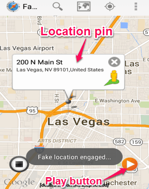 Step 3: After the location is displayed on the map, simply double tap on it to drop a location pin. As soon as you do that, it will display a popup with the address details of the location pin. At the bottom of the screen, there will be two different buttons: “Play” and “Stop”, which can be used to enable and disable fake GPS location on your phone. When you’ve placed the location pin, simply hit the “Play” button to change your current location into the fake one. You will also see a message “Fake Location Engaged” at the bottom, which indicates that the location has been changed by this app. If you want to put back your actual location, then simply open the app and tap on the “Stop” button.