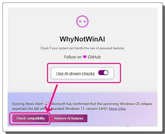 This tool performs comprehensive compatibility checks including AI capabilities. To run the check, enable the “Use AI-driven Checks” option in the tool and click the “Check compatibility” button.