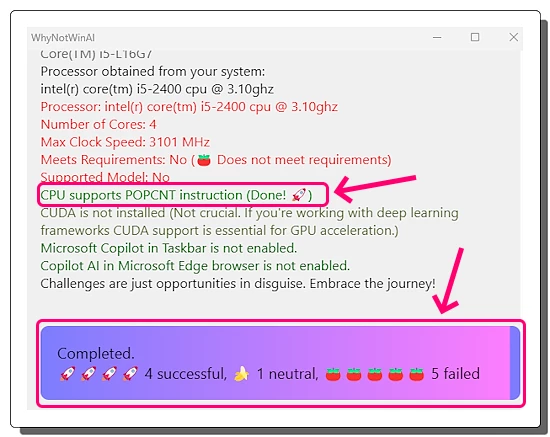 The tool takes a few seconds and gets the results. It shows how many checks were successful, how many checks were failed, and how many were neutral. You can go through the simple text report to view all the checks. The tool uses color codes to distinguish the successful and failed checks. In the report, you can verify whether the CPU supports POPCNT instruction or not.