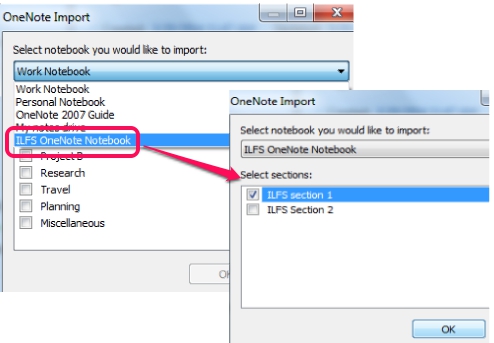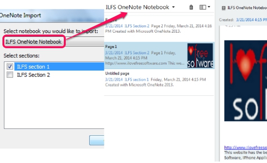 Step 3: In OneNote import window, search for required OneNote notebook using drop down menu, and click it. Immediately, categories (or sections) of that notebook will be visible to you, like visible in screenshot below. From the list of sections, simply select required ones or all sections, and tap on OK button.