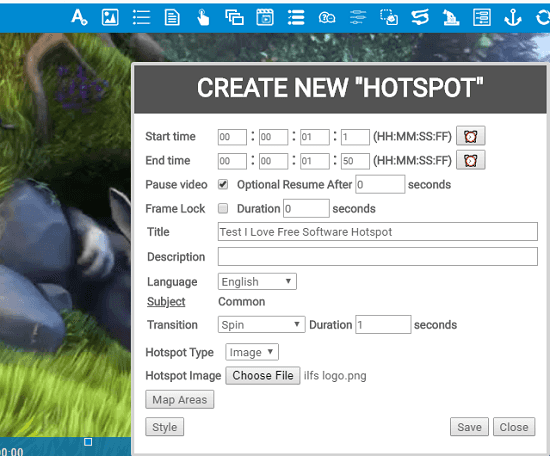 Specify the video information and other metadata that it asks and then it will load the video in the editor. You can review the video in editor itself. All the tools are aligned on the top and you can can use any tool from there. You can see the screenshot below of adding a hotspot in the video. You can choose on what area you want to add a hotspot and specify the duration for which it will visible in the video.