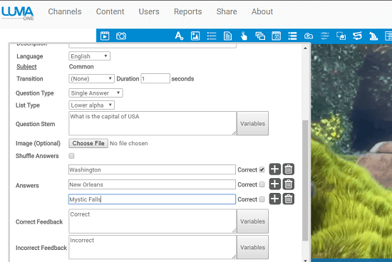 If you want to add a quiz then simply choose that from above toolbar. Give this component a title and then specify the question and then corresponding answers. Mark the correct answer and then also specify what to show when a user clicks on correct/incorrect answer.