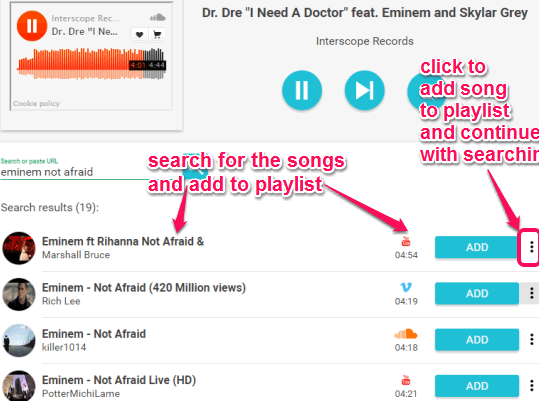 Now open your room and add songs to your room for creating the music playlist. You can add songs either by pasting the link or by searching for a particular song using keywords. Search results will show the songs available on YouTube, Vimeo, and SoundCloud. Use the ADD button and this way you can create your playlist with your favorite songs.