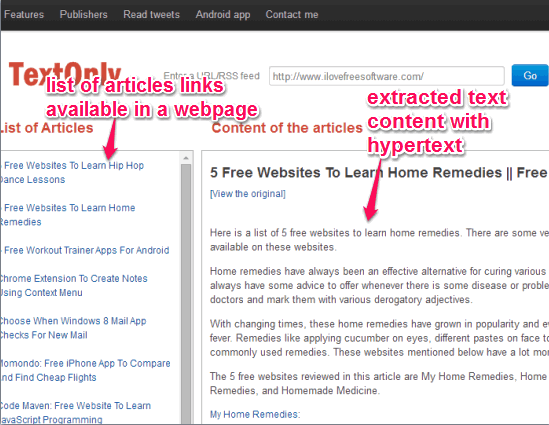 To fetch text with hypertext from a website or webpage, simply enter the URL at required box. After this, click on Go button. It will start the process of converting that webpage to a plain text with hypertext. As soon as the process is completed, it will extract all articles links and will place those links at left side.