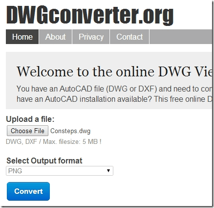 You just have to upload the DWG file whose size should not exceed 5 MB in size. Then you can simply select the output format, in which you want to convert. When done, you can simply click on the “Convert” button. It quickly generates the result file, that you can download directly on your computer.