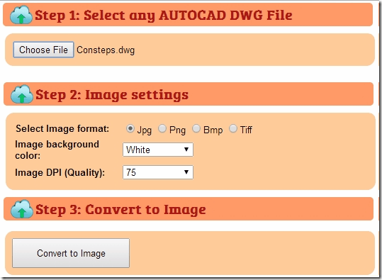 CoolUtils is another website that comes with online CAD converter that lets you easily convert DWG files into image formats. It has the ability to convert DWG to following formats: pdf, jpeg, tiff, cgm, png, and swf.