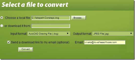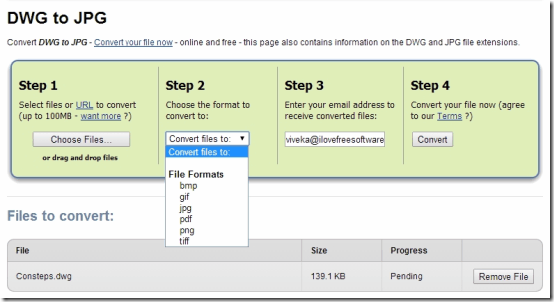For conversion, you just have to upload the *.dwg file from your PC or else you can provide the URL of the DWG file. Then from the provided formats, you have to choose format in which you wish to convert. Then you need to enter email address in order to receive the converted files. Once done with all the selections, you can click on “Convert” button.