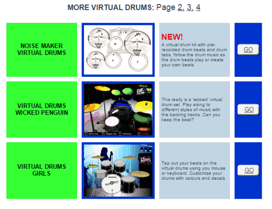 Drum Nuts is the second website for you and it has lots of different drum types for you. There are so many drum sets that you will be spoilt for choices. The list includes drum set name, thumbnail image preview, and a brief description. To play the drum set you like, click on the Go button. On selecting the drum set, the website shows you tips for playing that particular drum set perfectly. You can also comment using the Facebook login. The website includes some of the drum sets such that you can play them by simply dragging your mouse over them. No need of clicking them or hitting the keys on the keyboard.
