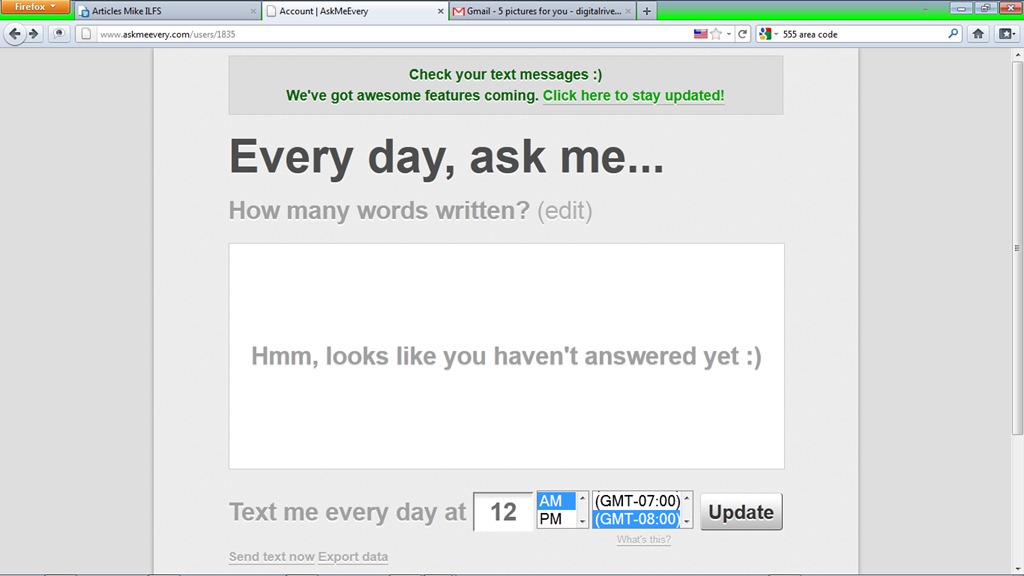 Ask Me Every is a web based application. So there is nothing to download. Simply go to the website, register your question and cell phone number, and forget it. It’s that easy. It looks like you only get one question per cell phone number, per day, so you need to be sure the question you register is the one you really need to remember to keep track of. The website will text you with your password. You can then login to your account on the website and make any required changes, like a password you can remember.