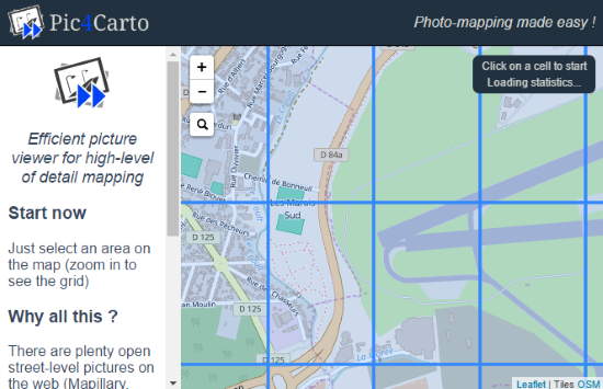 To find common creative images based on location using Pic4Carto is really easy, just visit its homepage from the link provided at the end of this tutorial. The homepage of this website shows a big map. You need to zoom into the area on the map from where you want to see creative common images. Just keep clicking on the map to keep zooming in, until you see a grid on the map.