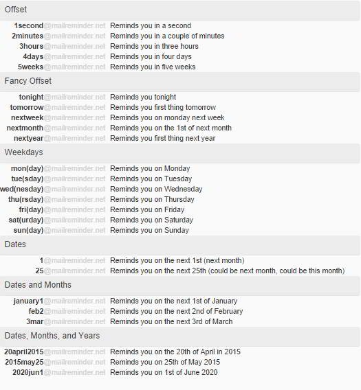 As I mentioned earlier, the beauty of MailReminder are the special email addresses to which you have to send the email to get reminder email at that specific time. Now, the email addresses are so intuitive that you don’t really need to remember them (as you saw in the two examples above). In addition to those email addresses, it has some special email addresses as well, like, tonight, tomorrow, any day of the week (monday, tuesday, etc.), and exact date.