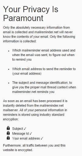 The biggest concern anyone would have while using this type of service is that the data of their confidential emails might be stolen. MailReminder seems to address Privacy Issue nicely.