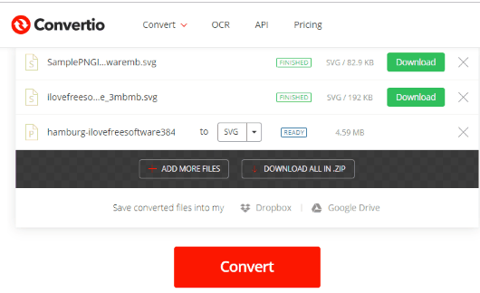 Convertio is one of my preferred options for online file conversion. The good thing is PNG to SVG feature is also available. Multiple PNG files (up to 100 MB per image) can be added from your Dropbox account, PC, or Google Drive account. After that, you can start conversion in a click. Maximum 2 PNG files are converted at once.