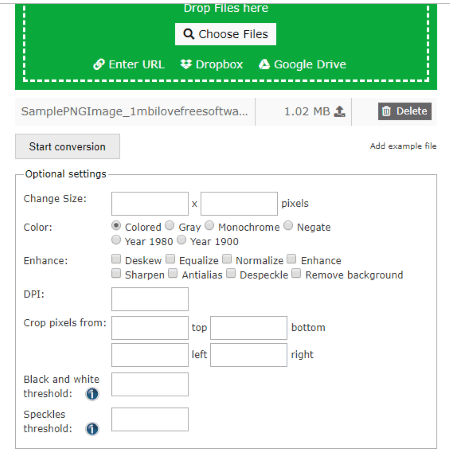 Online-converter.com (Homepage) is one of the best websites for PNG to SVG conversion. It also lets you convert multiple PNG files (maximum 100 MB all images) and you can add PNG images from your desktop, Google Drive, or Dropbox account. Before you start PNG to SVG conversion, there are some settings that you can configure. You can set output height n width, set DPI, crop pixels from right, left, top, bottom, set black and white threshold, etc.