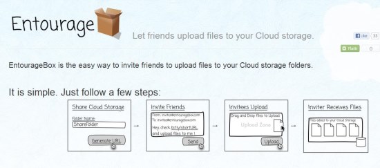 EntourageBox is a nice free service to share cloud storage for uploading documents and files by other people. It’s simple and handy, and charges nothing for inviting people to upload files to your cloud storage. Check it out now and give it a try!