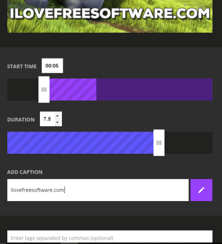 Step 2: After uploading the video file, you can preview it. Now scroll down the webpage to access the options available for generating the animated GIF. You will find an option to set the start position, a button and slider to increase/decrease the length for output, and options to add caption, tags, and source URL.